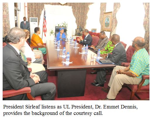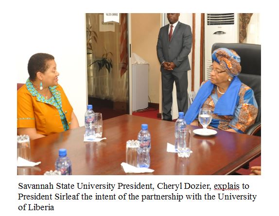 (MONROVIA, LIBERIA – Tuesday, March 4, 2014) The President of Savannah State University, Georgia, in the United States, has offered to form a partnership and collaboration with the University of Liberia in getting UL back to its pre-war status when it competed with world-class universities. According to an Executive Mansion release, SSU President, Cheryl Dozier, made the offer during a courtesy call to President Ellen Johnson Sirleaf on Tuesday, March 4, and said it was in support of President Sirleaf’s courage to see a revamped and quality education, and her institution stood ready to support the cause. SSU, said Madam Dozier, was willing to provide textbooks and enter into a student/faculty exchange program with UL and other institutions of higher learning. Savannah State, the only university awarding a degree in Homeland Security, was interested in extending its program by working with UL to see how the academic program can help Liberia with its ports of entry for the security of its border, with security being a global issue.Coming to Liberia to form a partnership with the University of Liberia was like coming home, she said, since Liberia and the State of Georgia have a rich black history in common regarding the emancipation of former slaves. Founded in 1890 by Richard R. Wright, Sr., who was born into slavery, Savannah State University is the oldest public historically black college in Georgia. Responding, President Sirleaf said she was grateful and honored that SSU would see Liberia as a home and, at the same time, announce the formation of a partnership with Liberia’s flagship tertiary institution. She said the historical connection with the United States was clear, as evident by the continuous support from past and current U.S. administrations and the Congress which has, over the years, made the United States Liberia’s number one bilateral partner. She expressed hope that the partnership will also encourage people-to-people outreach and increase the student/staff exchange.The President hailed UL’s President, Dr. Emmet A. Dennis, for being an ambassador in government’s quest to restore quality education in Liberia, especially at the tertiary level, describing him as bridge builder between overseas and Liberian universities.President Sirleaf briefed the visiting delegation about government’s development plans and actions in infrastructure development, naming roads, water and electricity. Plans being concluded will see roads, water and electricity projects either rehabilitated or restored, to attract visitors to beautiful tourist sites like Lake Piso, in Grand Cape Mount County. In his comments, Dr. Dennis expressed satisfaction that his efforts to resuscitate the University of Liberia were gaining momentum, and he praised President Sirleaf’s administration for the support in realizing the dream. He paid tribute to Liberia’s Honorary Consul General, Madam Cynthia Nash, for making contact possible with several U.S. universities.Dr. Dennis named Marine Engineering, Social Work and the Criminal Justice System as areas earmarked by the partnership. Such a partnership could help elevate the National Police Training Academy to an Associate Degree-granting institution, a plan that has already been initiated between UL and the Liberia National Police.