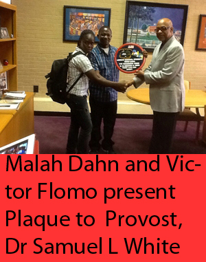 Liberian students were selected from a competitive process through the Civil Service Agency in Liberia as beneficiaries of the scholarships. The students are Victor O. Flomo, graduate student studying Workforce Education, and Malah M. Dahn, undergraduate student studying Agriculture. The students began classes for the Fall 2013 academic season and are getting acclimated to the school system. In an effort aimed at assisting the students in the process of readjustment, Mrs. DeContee Clements-Kanneh, Assistant to the Ambassador on Diaspora Affairs, recently visited with the students on campus on the day of their orientation.During Mrs. Kanneh’s visit, the students presented a plaque expressing thanks and appreciation to Dr. M. Christopher Brown, II, President of Alcorn University, on behalf of the Liberian National Student Union (LINSU). Dr. Samuel L. White, Executive Vice President and Provost of Alcorn University, received the plaque on behalf of Dr. Brown.