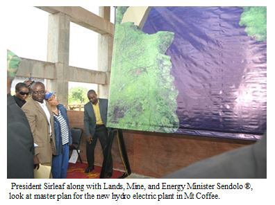 President Sirleaf Breaks Grounds for the Reconstruction of the New Mount Coffee Hydro Plant![]() (Harrisburg, Montserrado County – Sunday, January 26, 2014) President Ellen Johnson Sirleaf has broken grounds for the rehabilitation of the Mount Coffee Hydro Electric Plant, terming the occasion as “a good day for Liberia in its quest for affordable and cheap energy”. |